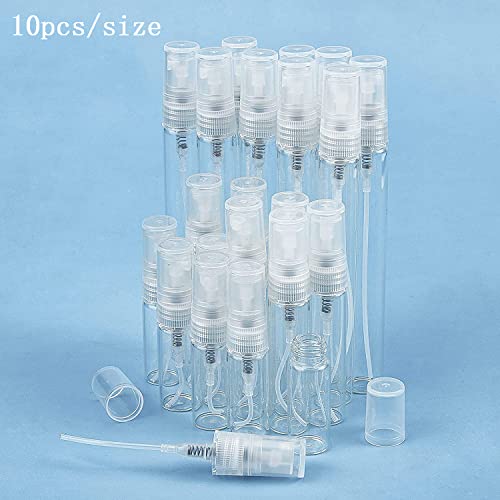 【Paket beinhaltet】 : Enthalten 30 Stück 3ml/5ml/10ml leere feine Nebelglas-Sprühflaschen mit Mit 2 Parfümspendern, 2 Trichtern, 2 Kosmetikstrohhalmen, 10 pro Größe.