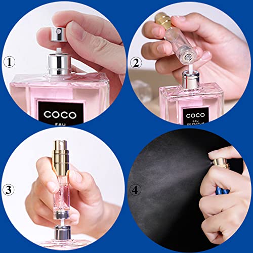 Einfach nachzufüllen – Mit dieser Parfümzerstäuberflasche können Sie das Parfüm in Sekundenschnelle nachfüllen. Sie müssen nur die Zerstäuberkappe und die äußere Hülle abnehmen, dann halten Sie den Boden des Zerstäubers über dem Parfümflaschenrohr und drücken es nach unten, bis es gefüllt ist.